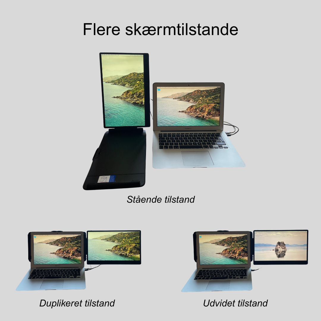 Vores Duoskærm er skabt til den moderne bruger. Med en vægt på kun 900 gram er den let som en fjer og passer perfekt i din taske, uanset om du skal arbejde, studere eller tage på eventyr. Uanset om du arbejder hjemme, slapper af på caféen, pendler i tog eller deltager i møder, kan du hurtigt opsætte skærmen og forbedre din visningsoplevelse. Denne praktiske løsning er designet til dig, der ønsker at skabe et effektivt arbejdsområde, uanset hvor du befinder dig.